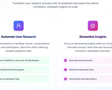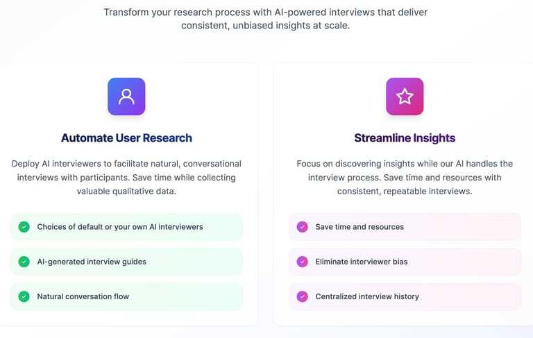 If we couldn’t scale research with people, we could scale it with AI as a moderator. Instead of manually preparing guides, scheduling interviews, and conducting them one by one, what if we created an AI-powered interviewer that could